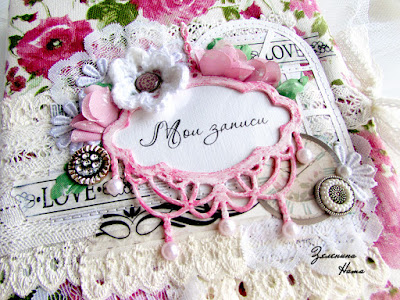 Для декора использовала много кружева, декоративный скотч, жемчужные полубусины, пуговицы, чипборд, вырубку, брадсы. Для надежности большую часть элементов пришила на машинке к обложке. Добавила цветов, один из которых связала крючком. Постаралась сделать декор максимально плоским, чтобы было удобно в ней писать.