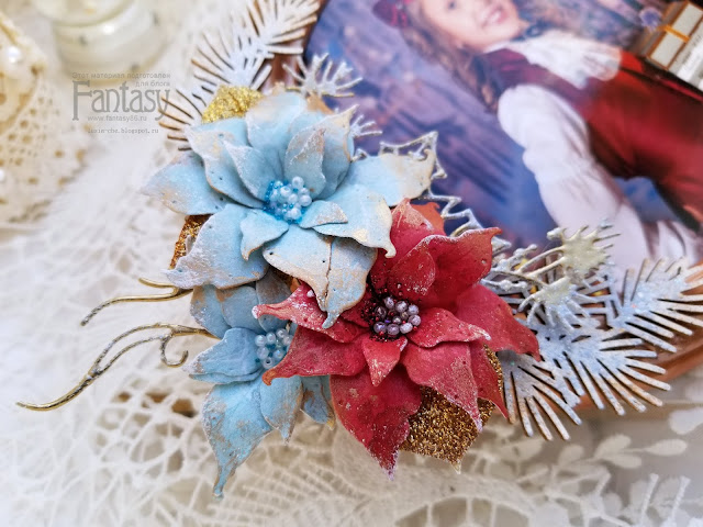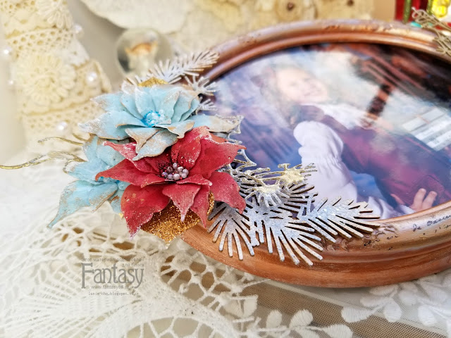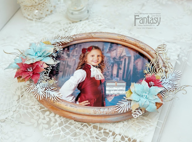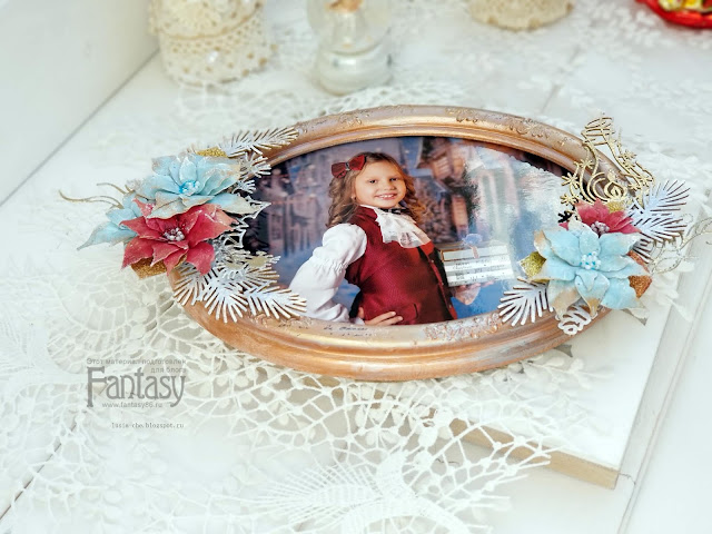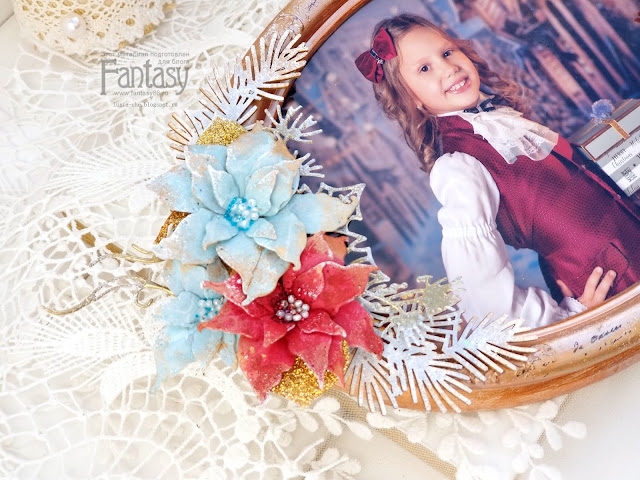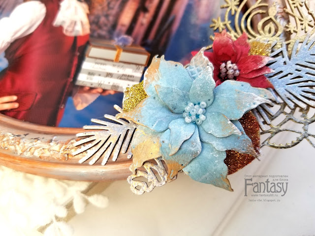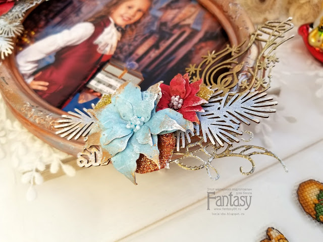 Рамочку я декорировала с помощью разнообразных красочных материалов, вырубки и чипборда "Fantasy". Вот какие ножи и чип я использовала в декоре: Пуансеттия 1, Рамка с пуансеттией,Стимпанк 1, Круглая рамка с еловой веткой, Еловая ветка плюс шишка, Волшебный фонарик.