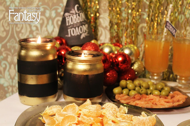 В этом году Новый год я решила отмечать в черной с золотом палитре. И к столу я сделала несколько баночек-подсвечников в этом цвете. Я поделюсь с вами небольшим мастер-классом по их созданию.