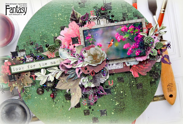 Я неоднократно рассказывала вам о своём любимом приёме - делать вырубку из акварельной бумаги, покрытой красками металлик, так поступила и на это раз, только ещё и фон работы тоже покрыла такой красочкой.