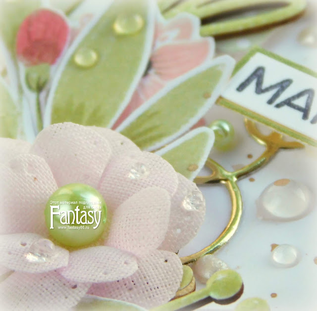 Добавила сюда также немного геометрии. Фоновую вырубку из зеркального картона разрезала на части и добавила в слои. И вот такие кружочки-негативы использовала, как яркие акценты. Уже несколько моих последних работ не обходятся без этих чудесных тканевых цветочков, сделанных с помощью набора ножей "Распущенная роза".