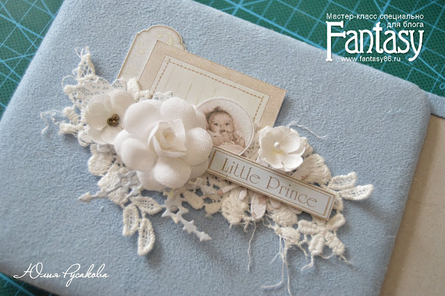 15. Придвигаем поближе декор - цветочки, пуговички, кружево. Из остатков скрап-бумаги делаем вырубку для оформления страничек.