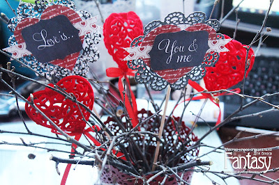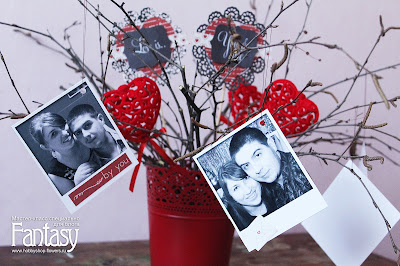 На дерево я решила повесить наши совместные фото. Распечатала их в форме полароидной фотографии и немножечко задекорировала вырезанными сердечками и конвертиками из этого же скрап-набора.