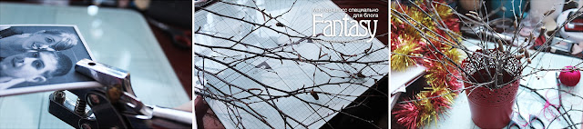 Делаем отверстие в углу фотографии и привязываем веревочки. Берем наши собранные веточки. Обрезаем их до нужной нам длины и ставим в вазу или бутылку. Ну или кашпо, как сделала я)))