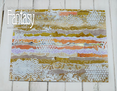 Заготовку с подготовленным уже и собранным из полосочек фоном, разбавляю фрагментами из текстурной пасты, просто хаотично. Получается примерно вот так.