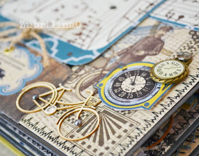 Во всем альбоме использовала самодельные фишки из пробки от бутылки шампанского. На некоторых ставила штампы (совсем недавно видела МК на эту тему), на других - шестеренки и брадс.