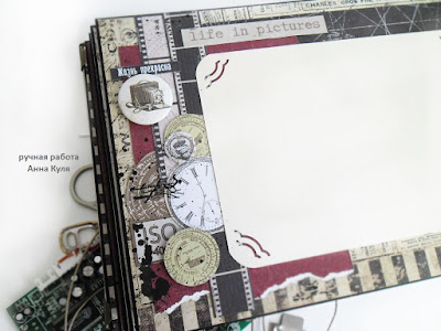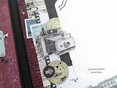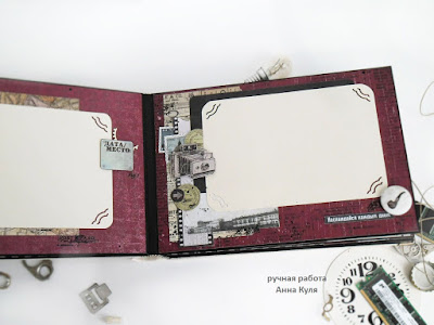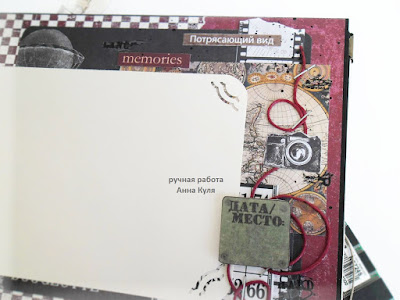 Пятый разворот единственный, где в основе лист Примы. Из одного листа 30*30 см. получились две странички, а акцентами стали кинопленка и винтажные вещи - глобус, часы, камера-фишка... На каждой странице старалась расположить высечку, где можно написать дату и место путешествия.