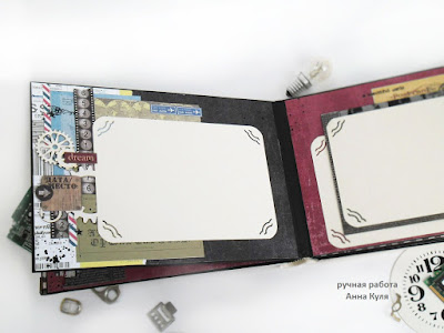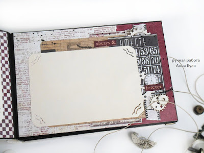 Четвертый разворот нравится своим винтажным настроением. Пожалуй он получился самым "старинным"по настроению за счет карточек из коллекции "Лавка древностей"и цветовой гаммы. Хотя казалось бы, такой активный принт у листа в клетку!