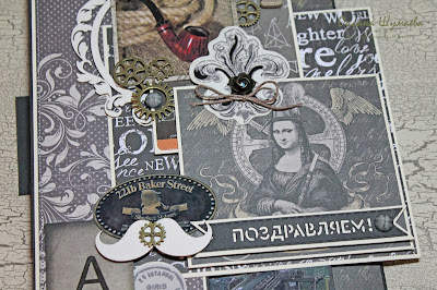 Дизайнерскую бумагу (кардсток), нож для вырубки, чипборд - усы, металлические украшения - шестеренки, брадсы текстильные "Клетка", вырубку, высечки, граненые камушки, скрап-бумагу 7Dots, лист "Машина Различий" из коллекции "Механические Иллюзии" от ScrapBerry's.Ну и ежедневные рабочие инструменты и материалы, а именно: резак, линейка, нож, клей, скотч и т.п.
