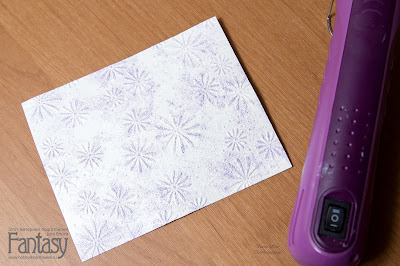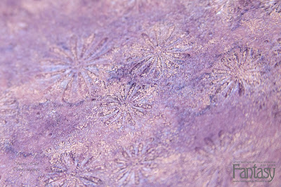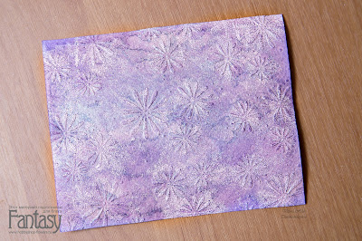Теперь подбираем контрастный по цвету или насыщенности спрей. Я взяла спрей "лаванда", дающий мягкий контраст с розовой пудрой. Чтобы добавить перламутровый блеск, брызнула спреем-хамелеоном "нежный шебби", получился сине-розовый оттенок. Просушиваем феном. Чуть влажный лист я советую положить под пресс до полного высыхания.