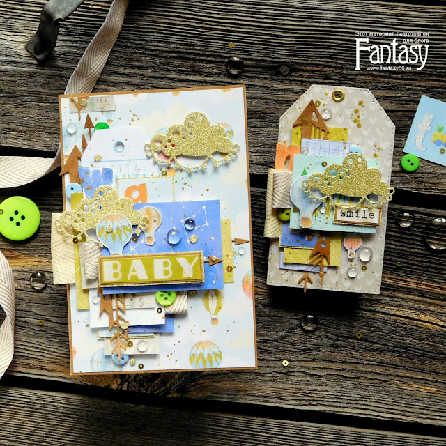 Захотелось мне сотворить что-нибудь светлое и весёлое, получилась вот такая парочка с золотыми облаками - открытка и тег.