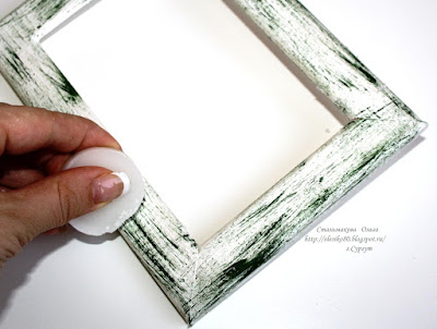 6. А теперь наносим одним слоем по всей рамке ту краску, которая получилась у вас при смешивании (у меня получилась нежно-розовая)... и после высыхания нам понадобится наждачная бумага... При помощи наждачки)) снимаем слой нежно-розовой краски, но снимать её тоже надо в хаотичном порядке, чтобы получился эффект потёртости...