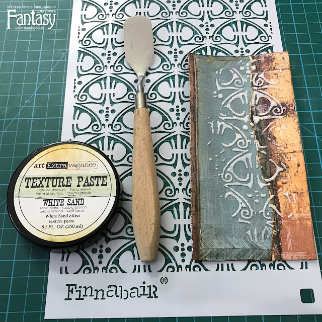3. Using a palette knife, apply any texture paste onto the card panel through a stencil. Here, I've used White Sand Texture Paste and Finnabair's stencil.