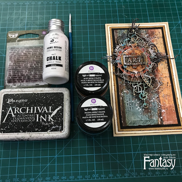 5. In the end, once all the elements are adhered. To add the rusty look, apply some rust and patina pastes onto the composition in some places, stamp the background with black archival ink, add some white highlights using white gesso/chalk paint and lastly, create white ink splatters.
