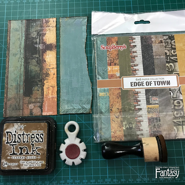 1. Cut up pattern papers (with grungy designs) to form the card panel. Distress their edges and ink them with vintage photo distress ink.