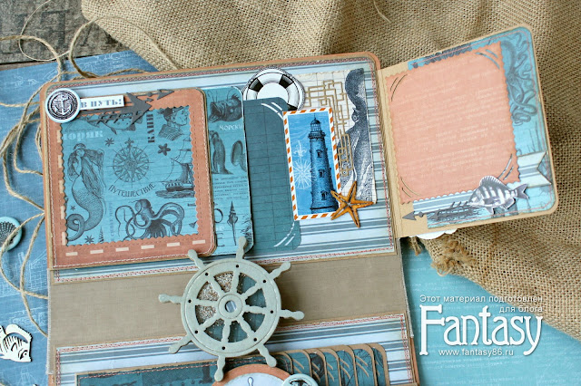 набор бумаги, скрап-карты"Мое море"и "Моя мечта", набор чипборда "Русалка", фишки из наборов "На море"и "Вокруг света".