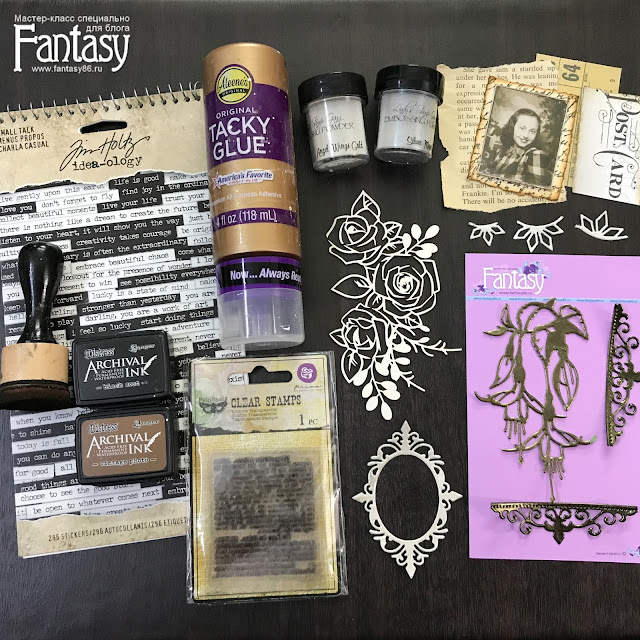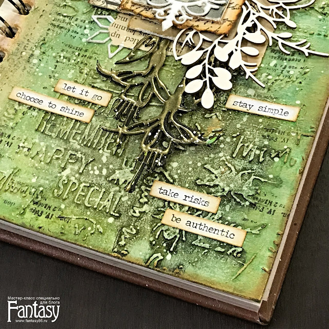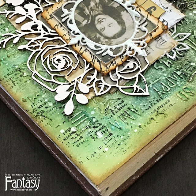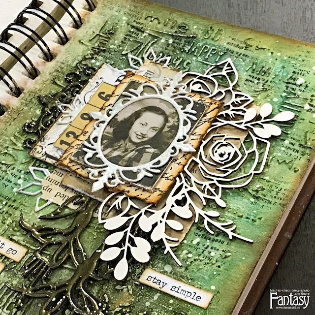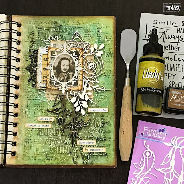 4. The last step is to gather all the elements for layering, create a visually pleasing composition and adhere them to the page. I've heat embossed some beautiful Fantasy die cuts using Lindy's Embossing Powders. For the layering, I've used a Vintage photo, old book page, vintage ephemera, word stickers, Fantasy die cuts and chipboard. In the end, stamp all around the page using archival ink, distress the edges of the page and create white ink splatter.