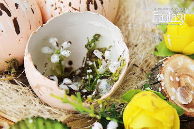 Приклеиваю к основе яички. В серединку разбитой скорлупы я приклеила мох и несколько мелких цветочков. Далее акриловой коричневой краской наношу крапинки на скорлупу. Затем побрызгала еще и белым акрилом. Последние штрихи...добавила акриловых капелек. Как будто утренняя роса выступила. Капельки можно сделать и глосси акцентом. И по бокам посадила несколько бабочек, сделанных горячим эмбоссингом на кальке.