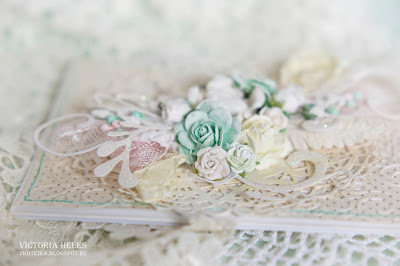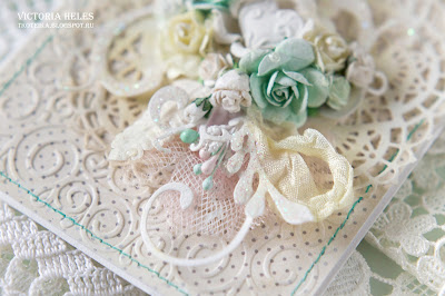 Для придания объема композиции в этот раз использовала необычный для себя материал - кусочек розового фатина, дополнив его шебби лентой...
