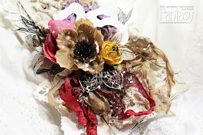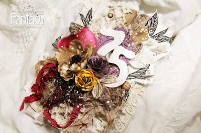 За основу взяла бумагу от Prima Marketing Princess, шебби-ленты, цветы, кружево, рамочку из полимерной глины, вырубную салфетку, металические украшения, граненные камушки и спреи Lindy's из коллекции Moon.
