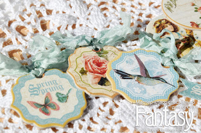 9.Декоративный чипборд, в котором предусмотрены отверстия, украшаем шебби-лентами.