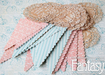 - набор бумаги Graphic45 Sweet Sentiments 30*30, можно заменить любой другой нежной коллекцией. На гирлянду из 12 флажков у меня ушло 4 листа 30*30 + 1,5 листа на вырубные салфетки + 2 листа с вырезалками (из них я вырезала надписи, марки);