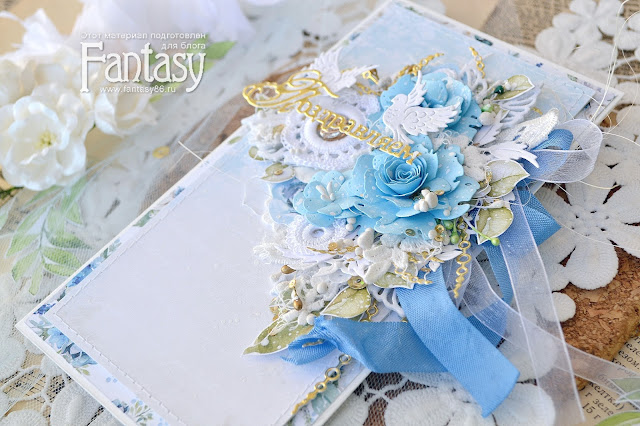 Палитру выбрала нежно-голубую с золотыми акцентами, добавила чуть-чуть зеленого в виде вырезных листиков и синюю ленту! Получилась легкая, практически невесомая композиция, но в то же время, как мне кажется, есть что поразглядывать!