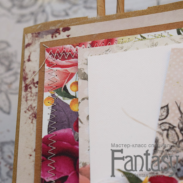 I put the papers in layers and previously sewn them on the sewing machine.Then I made a rich composition of paper elements, flowers from paper and fabric, foil and chipboards.