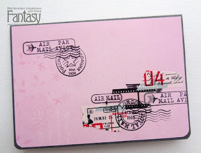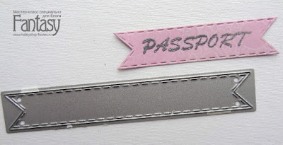 Теперь продумываем композицию. Если нет ножа для вырубки, надпись «Паспорт» можно сделать сразу на подложке. Штамп можно сделать и позже, но если это будет горячий эмбоссинг, то сделайте надпись сейчас, до наклеивания картинки и бумажного скотча.