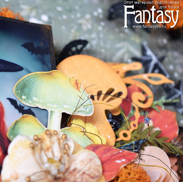 Around the photo I've arranged a rich composition of paper elements cut from Fantasy dies, fabric and paper flowers.I added a lot of mushrooms to the magic soup ;)As the background of the photo, I used natural elements: twigs and moss.