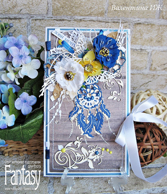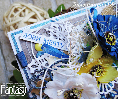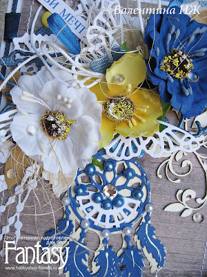 Ловец мечты и снов богато украшен полужемчужинками и жидким жемчугом Dovecraft 3D Pearl Effects Pastel Purple. В цветочной композиции использована вырубка, сделанная при помощи ножа для вырубки от Fantasy "Россинки". Я вырубку разделила на 3 части и расположила его в букете. Это придает композиции динамику и равновесие.
