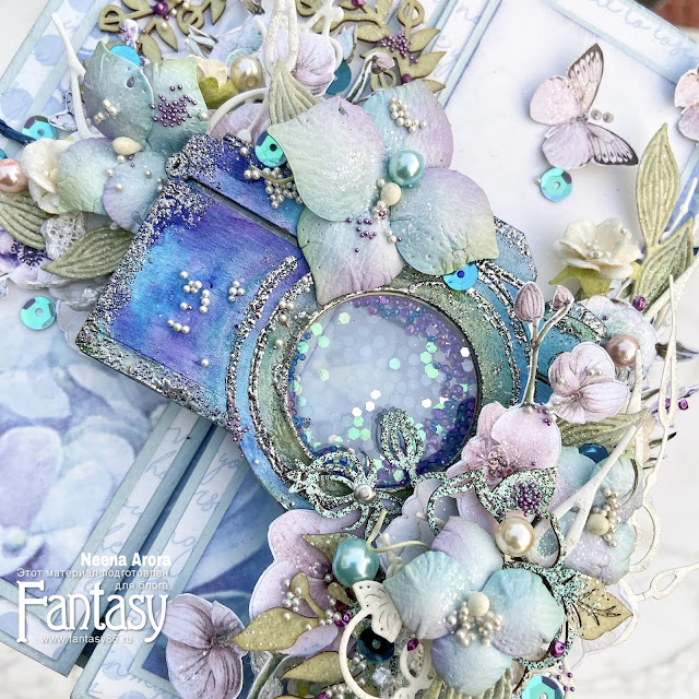 I love hydrangea flowers and it's knive from fantasy dies. It gives beautiful lines on the petals. I have used blue cardstock to make the flowers. In this, I used shaker camera chipboard as a focal element which I coloured using sprays. I heat embossed other die cuts and chipboard.