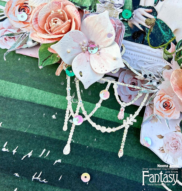 I have applied texture through the script stencil. after building the composition I added microbeads, sequins and glitters to beautify the layout. L et's have a closer look at the photos how gorgeous chipboards and die-cuts look: