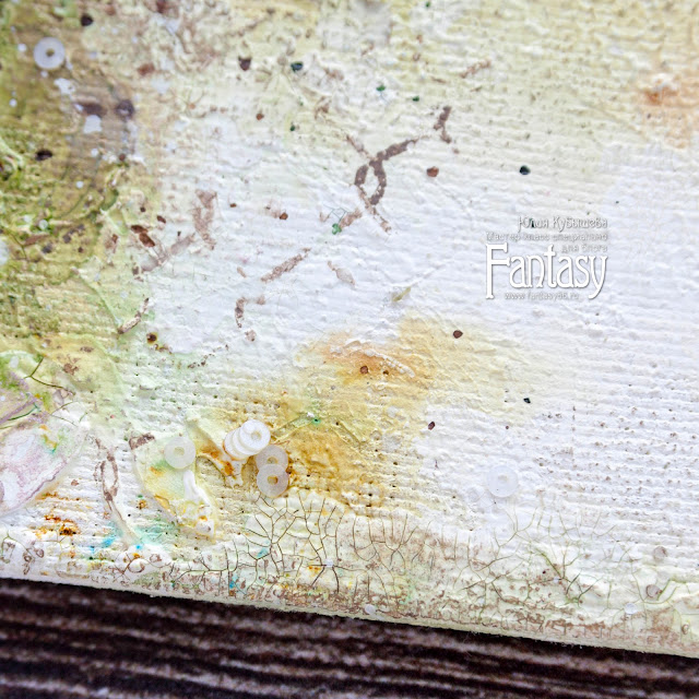 Я сделала холст для фото, которое, к слову, можно менять (да что там, я же часто так делаю - практик). Много зелени и цветов освежают взгляд, понимаешь, вот-вот еще чуть-чуть и придет весна. В работе, как всегда, много разных материалов и фактур, это оживляет работу всегда.