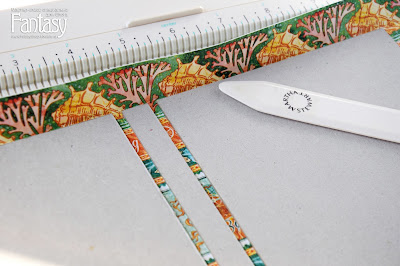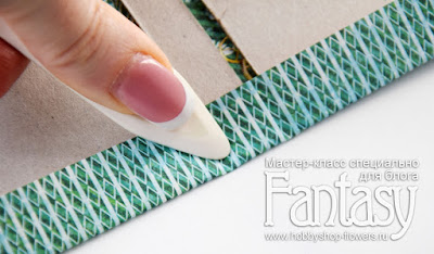 Сначала я бигую всю заготовку по периметру, затем загибаю срезы скрап-бумаги внутрь и проглаживаю плоской стороной палочки.
