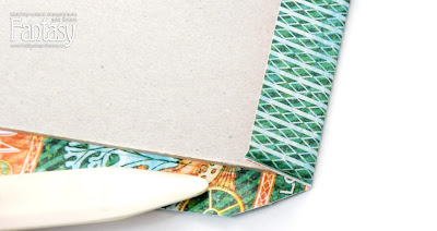 Прижимаю палочкой маленькую срезанную часть, приглаживаю к краю переплетного картона. Делаю это со всеми четырьмя углами, придаю бумаге форму. Теперь можно все приклеивать)