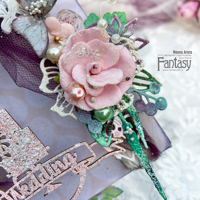 I also made a Mini Album for the box to save memories. Cover page decorated with fantasy die and prima flowers.