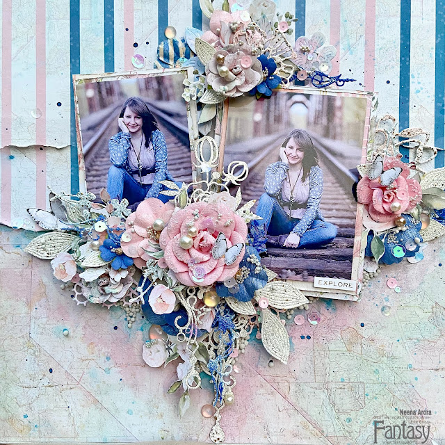 I used two different pattern papers to create this page and to match the colors of the page I colored the lacecut die-cut to other Diecuts and chipboards I embossed with white gold embossing powder. The photograph used here is found on the interest which I will replace later with my own photograph.