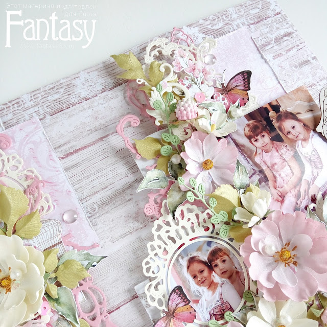 В этой страничке я использовала по максимуму бумагу, вырубку и цветы. Здесь очень мало топпингов, нет кружева, но тем не менее страничка смотрится полноценной, многослойной, воздушной, это в том числе благодаря вырубке, сделанной из разных материалов, дизайнерского кардстока, ткани и бумаги для пастели цвета слоновой кости. Поэтому, имея под рукой совсем не хитрый набор скрап-материалов и машинку для вырубки, можно сделать интересные работы, которые хочется подолгу рассматривать.