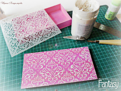 Декорируем нашу крышку. Берем текстурную пасту, мастихин и понравившейся вам трафарет, маску. Прикладываем трафарет и наносим пасту равномерным слоем по всей поверхности.