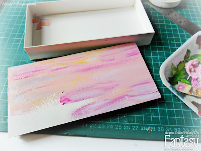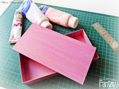 Берем плоскую синтетическую кисть, набираем краску и мазками, способом лессировки, наносим на нашу заготовку в одном направлении, что бы не смазать цвета и не превратить их в грязь. После того, как вы нанесете краску на всю поверхность, можно пройтись полувлажной кистью по всей поверхности, что бы сгладить переходы, но не фанатично, так как лишняя вода может повести и расклеить картон. Каждый элемент просушиваем феном.