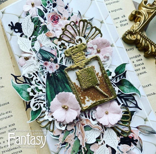 Для основы конверта я взяла лист акварельной бумаги формата А4, высечки от Mintay paper и вырубку любимыми ножами Fantasy. Основным элементов стал шейкер - флакон духов, его я сделала сама (весь процесс можно посмотреть в записи)