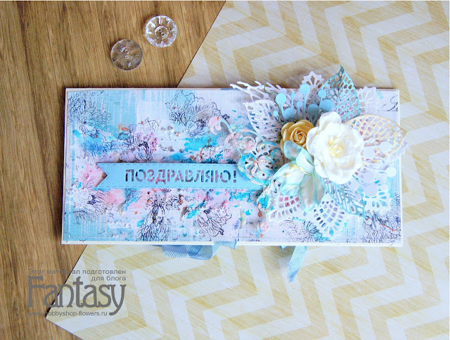 В работе я использовала: бумагу для скрапбукинга (я использовала 1 лист от LAE из коллекции "Муза"), клей, чипборд, текстурную пасту с шариками, WHITE GESSO, штампы, шебби- ленту, спреи, жидкий жемчуг, а также ножи от FANTASY - "Россинки"и "Поздравляю", цветы лилии, магнолии, розы.