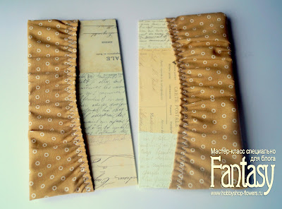 Когда наша обложка готова, приклеиваем посередине полоску ткани, закрывающую перемычку между картонками.