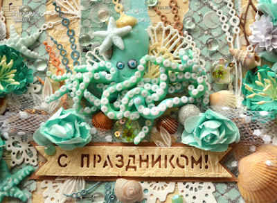 Палитру для своей работы я выбрала беж-бирюза. В таких оттенках выбрала кусочки бумаги из остатков, несколько морских ракушек, вылепленного из глины осьминожку и пару звезд, готовую вырубку в виде веточек, цветочки и ножи от Fantasy и для основы взяла кардсток крафтового цвета.