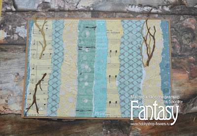 После полного высыхания пасты, я самодельный фон пристрочила к основе открытки.
