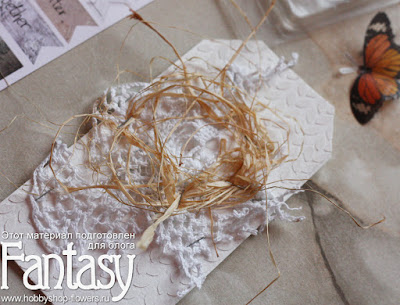 Я рву кружево на части и накладываю его на тег слоями. Так же добавляю рафию.