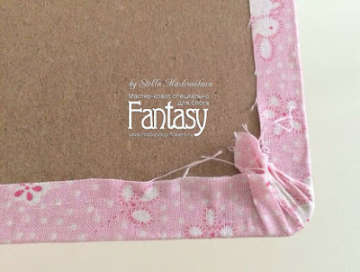 Теперь формируем круглые уголки: промазываем клеем угол заготовочки, берем пальчиками уголок ткани и натягиваем по середине, биговальной косточкой прижимаем ткань.