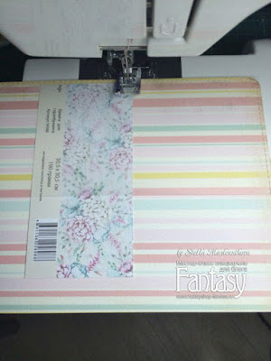 Не забываем про крепление папки, в данном случае папка будет закрываться на бархатную резиночку. В большинстве случаев я креплю резиночку к верхней обложке, мне так больше нравится. Примеряем резиночку и пристрачиваем ее на машинке.
