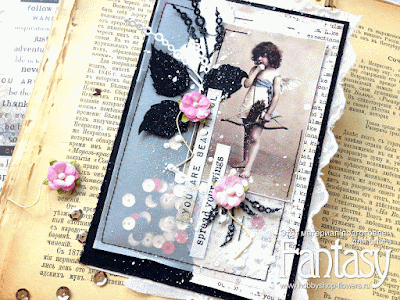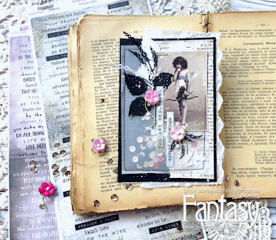 Добавляю наклейки, цветы, заминаю пальчиками края всех подложек и щедро сбрызгиваю разбавленным грунтом всю открытку, предварительно закрыв девочку кусочком бумажки.